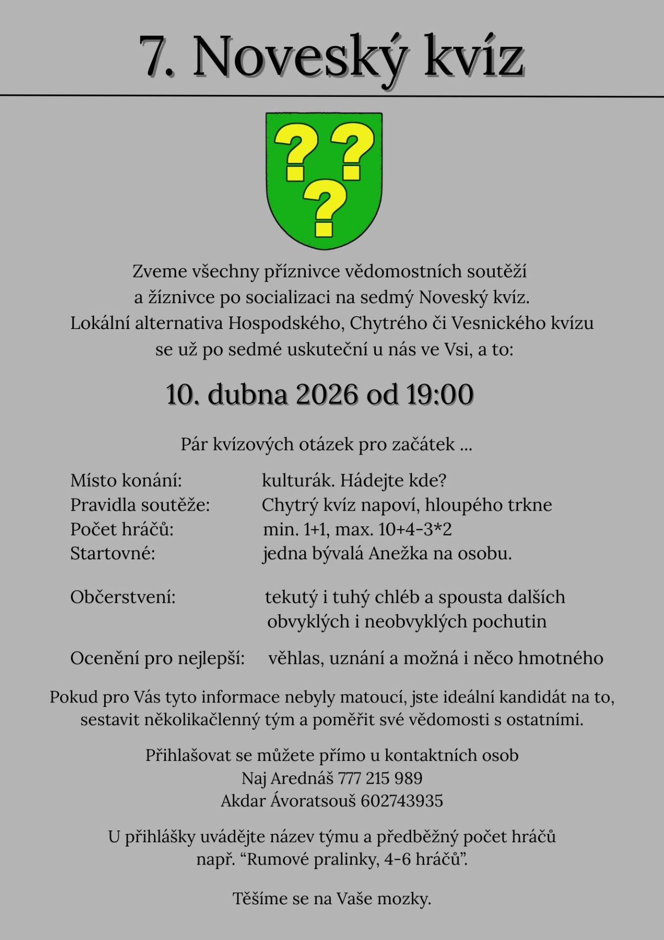 Zveme všechny příznivce vědomostních soutěží na 7. Noveský kvíz, který se uskuteční 10. dubna 2026 v kulturním domě č.p. 86 v Nové Vsi u Nového Města na Moravě, a to od 19:00 hodin. Bližší informace v přiložené pozvánce.